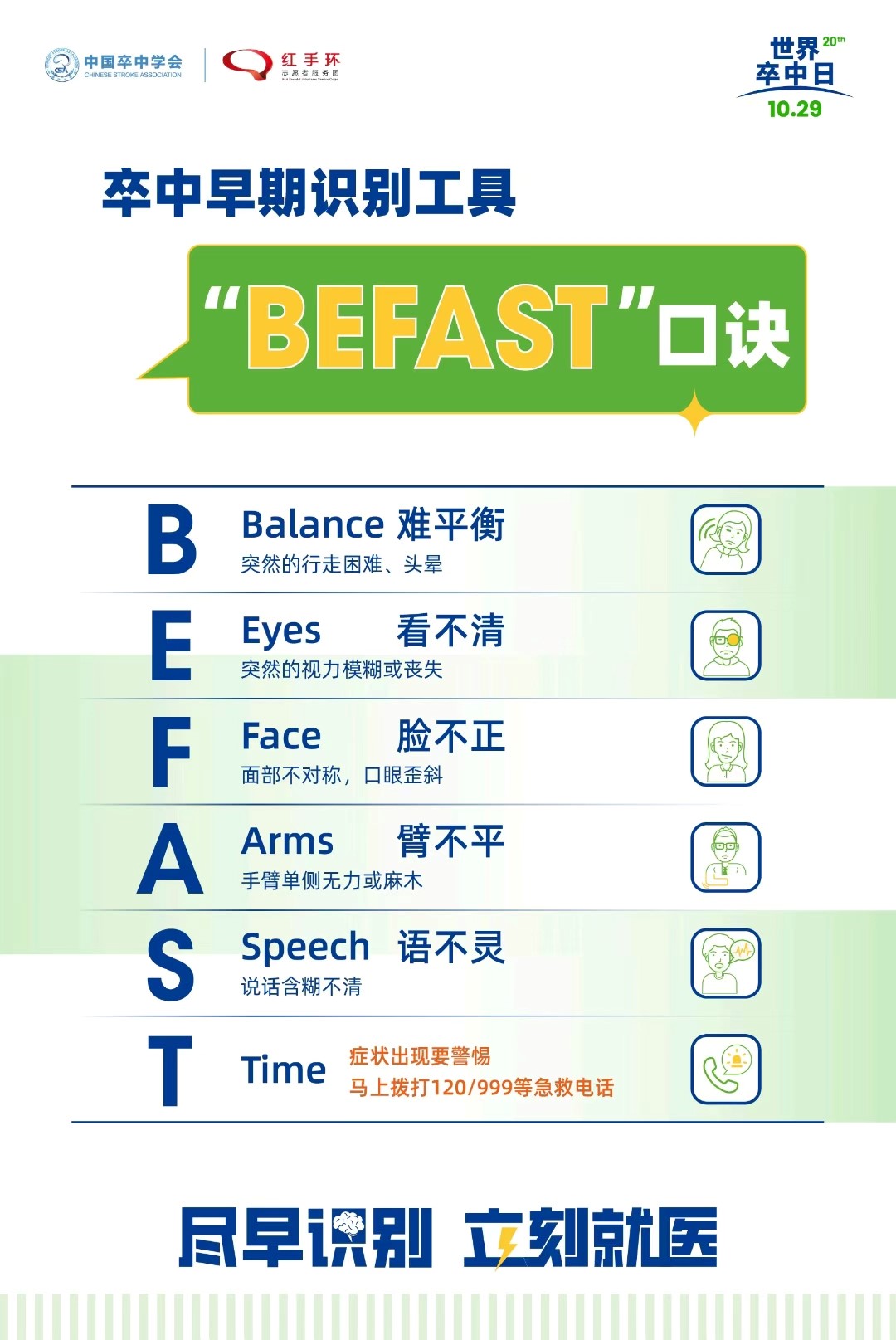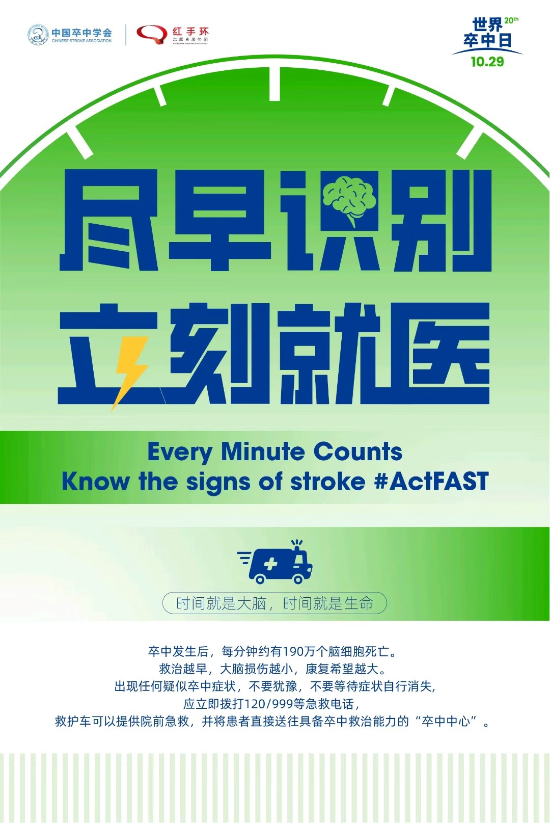 2025年10月29日是第20个“世界卒中日”。中国卒中学会结合我国情况,确定中文主题为“尽早识别,立刻就医”。