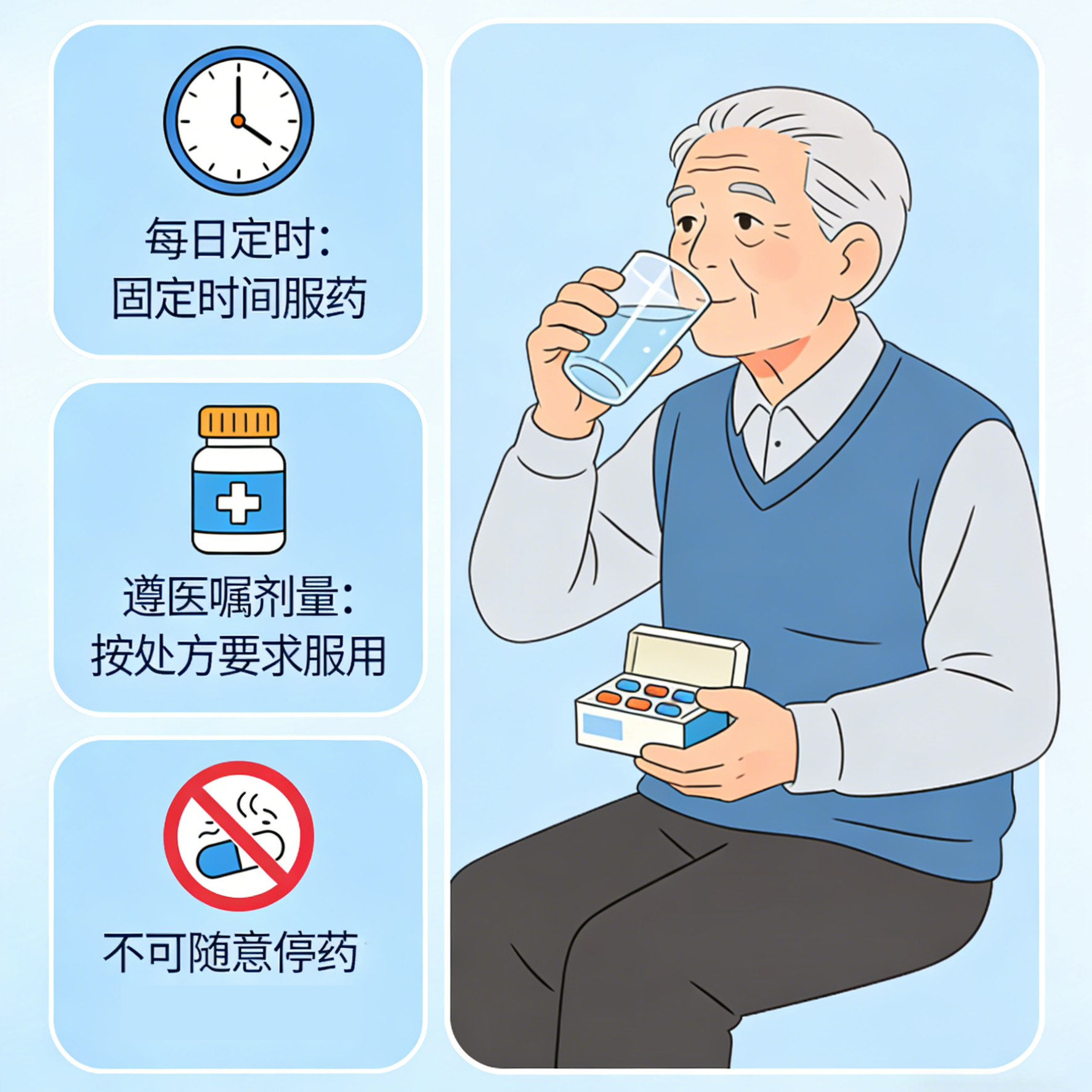 规律服药,绝不擅自停/减:降压、降糖、降脂、抗血小板药,按时按量。